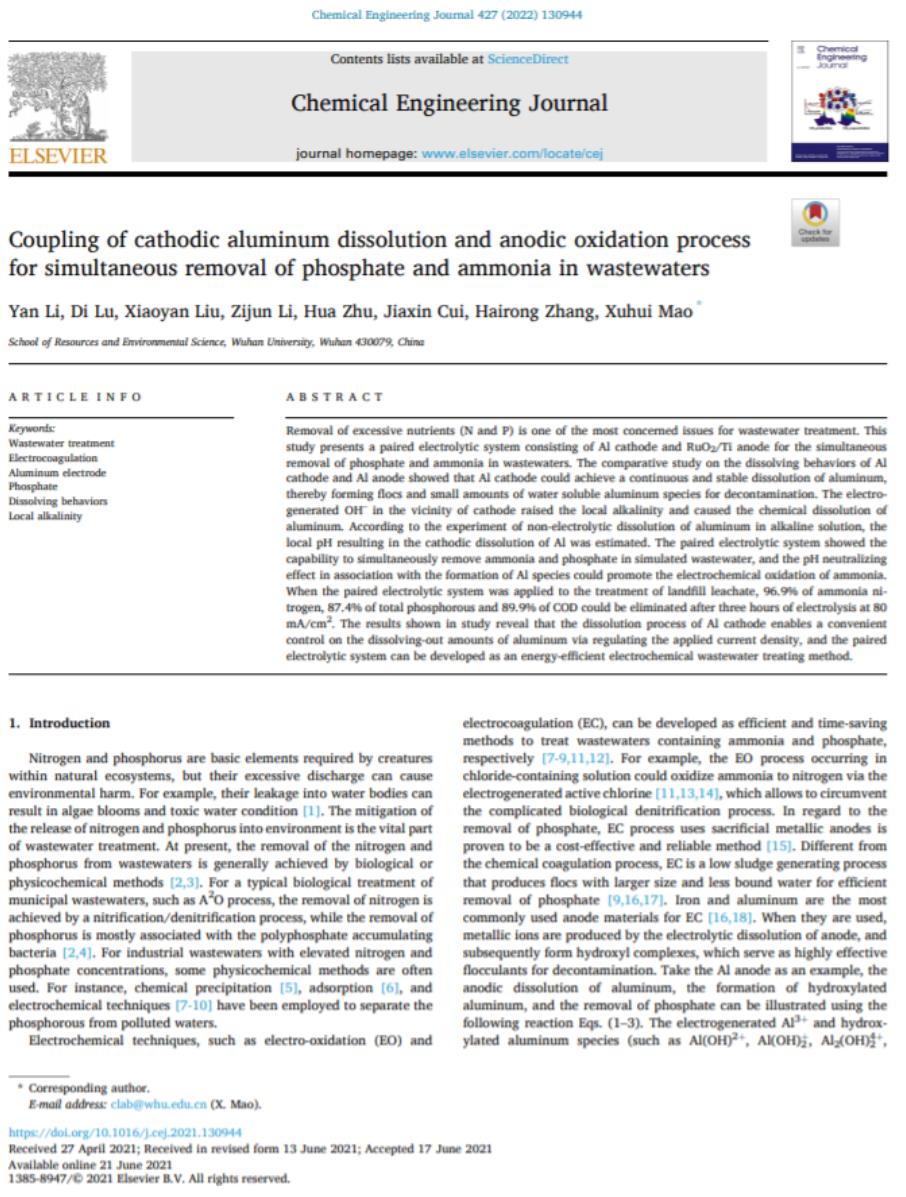 武漢大學用我公司生產的BOD-Q水質測定儀采集的BOD數(shù)據(jù)在國際期刊《Chemical Engineering Journal》上發(fā)表題為“Coupling of cathodic aluminum dissolution and anodic oxidation process for simultaneous removal of phosphate and ammonia in wastewaters”的論文,研究使用我司生產的BOD-Q水質測定儀對垃圾滲濾液的BOD進行了測定,該論文的發(fā)表標志著我司儀器的測定數(shù)據(jù)具有高度的精準性和可靠性,為今后科研人員了解并使用我司研發(fā)的儀器提供有益的參考。